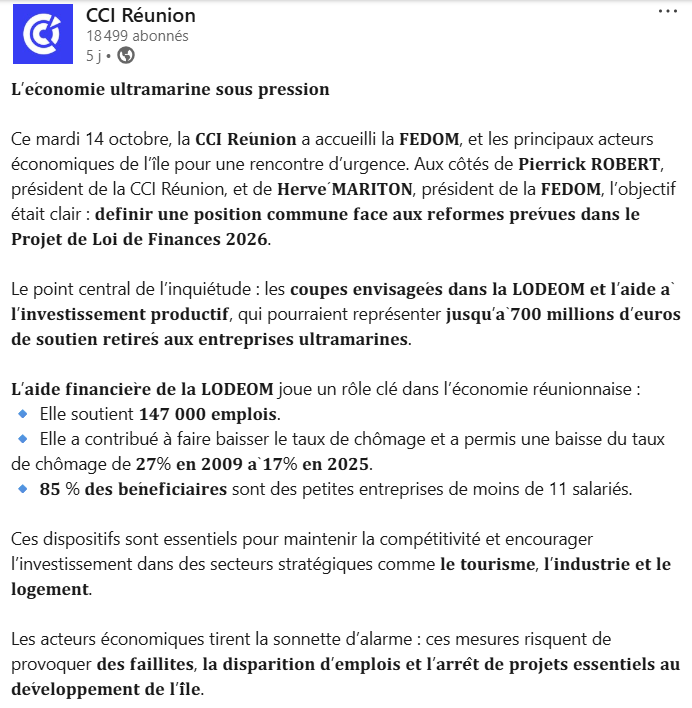 La présentation du projet de loi de finances et du projet de loi de financement de la sécurité sociale pour 2026 a confirmé nos craintes avec une maquette budgétaire désastreuse pour nos économies faisant état de coupes inédites et inacceptables dans le budget des Outre-mer ciblant massivement les dispositifs de soutien à la compétitivité et à l’investissement à savoir :