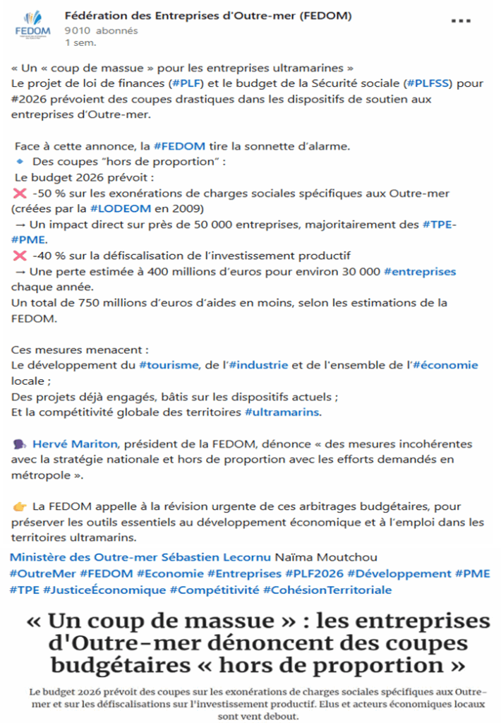 Voir également : Les députés sauvent « la défisc’ » en commission ; Les élus d’Outre-mer vent debout contre les coupes du budget 2026 ou encore Première victoire à Paris pour maintenir la défisc’ nationale ; Projet de budget des outre-mer 2026 : les députés ultra-marins unanimement contre « la cure d’austérité »
