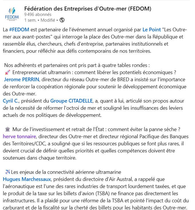 Linkedin : Fédération des Entreprises d’Outre-mer (FEDOM)